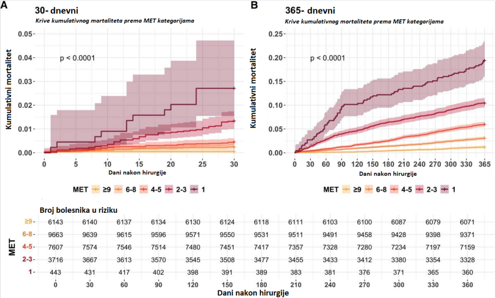 - U poređenju sa bolesnicima sa MET ≥9, mortalitet raste u svim nižim MET kategorijama, sa jasnim porastom rizika kako MET opada – posebno izraženim nakon 365 dana.