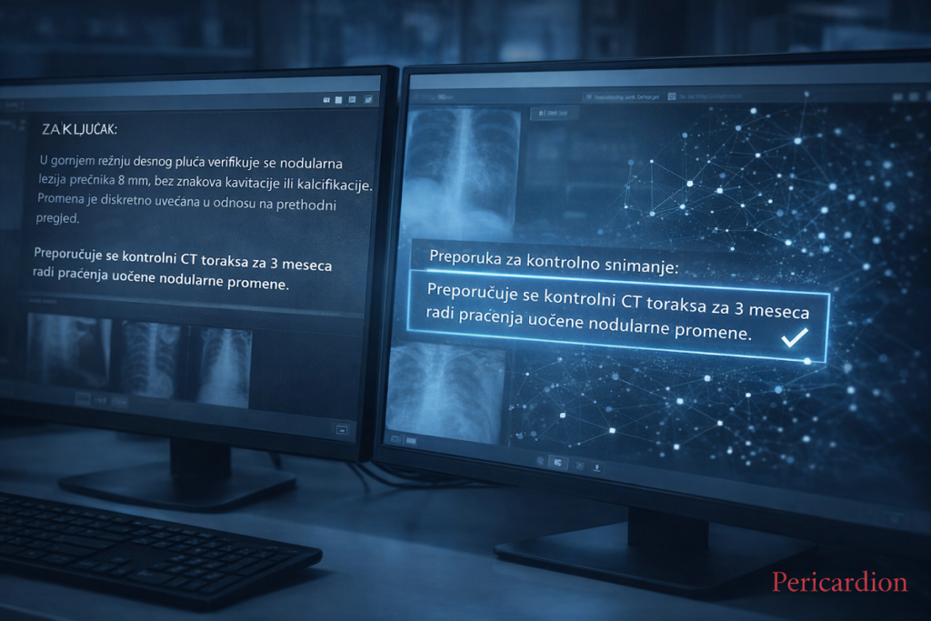 Upotreba alata veštačke inteligencije (AI) za evaluaciju plućnih nodula na niskodoznim CT (LDCT) pregledima dovodi do značajnog povećanja detekcije klinički relevantnih nalaza, ali bez skraćenja vremena interpretacije u realnim kliničkim uslovima. Ovi nalazi potiču iz prospektivne, randomizovane studije objavljene u martu 2026. godine u American Journal of Roentgenology. Studija je sprovedena kao randomizovano ispitivanje u realnom kliničkom okruženju, sa ciljem procene efekta AI asistencije na rad radiologa u skrining populaciji asimptomatskih ispitanika. Ukupno 911 ispitanika randomizovano je u grupu sa AI podrškom (n=447) i grupu bez AI (n=464). U interventnoj grupi korišćen je komercijalni AI sistem integrisan u PACS, koji
