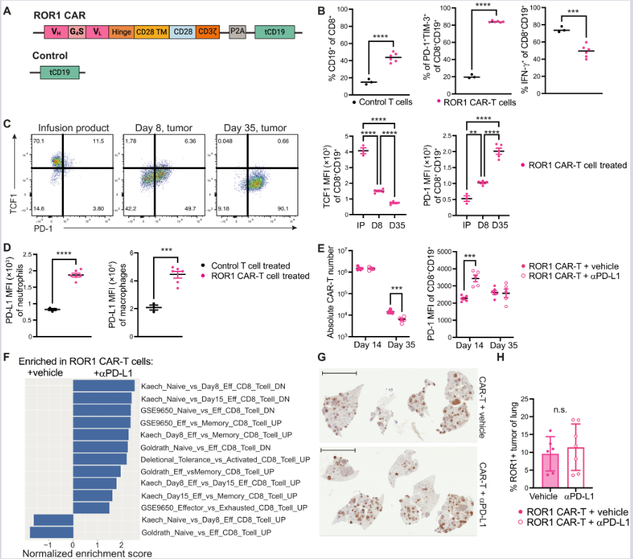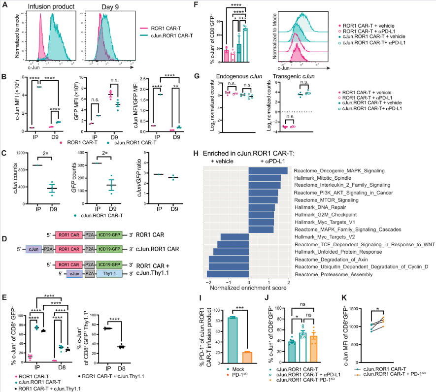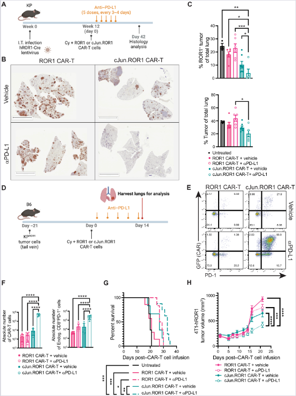 (D–F) Šematski prikaz konstrukata i kvantifikacija c-Jun proteina u cJun.ROR1 ćelijama (dan 5 i 8). Blokada PD-L1 značajno povećava stabilnost c-Jun proteina u tumorskom mikrookruženju. n = 4–5 miševa/grupi.