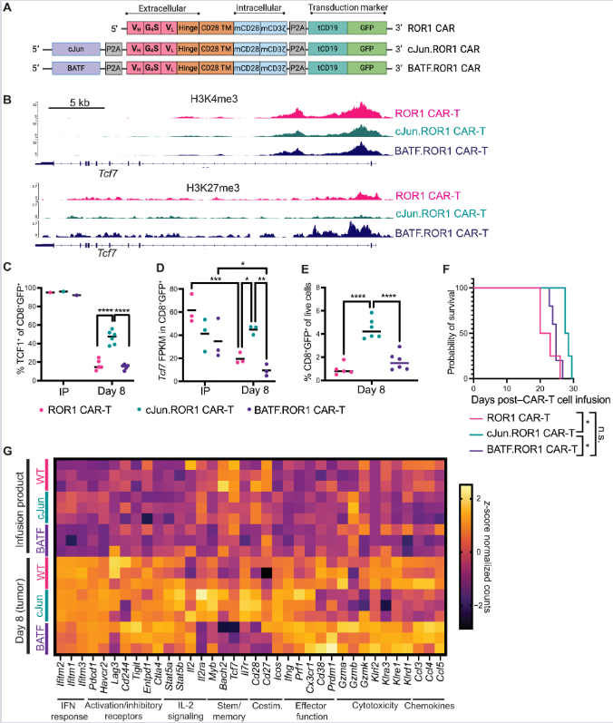 (E, F) Akumulacija CAR-T ćelija u tumoru (E) i preživljavanje miševa (F) nakon Cy + CAR-T terapije. cJun.ROR1 varijanta pokazuje superiornu akumulaciju i preživljavanje. n = 4–6 miševa/grupi.