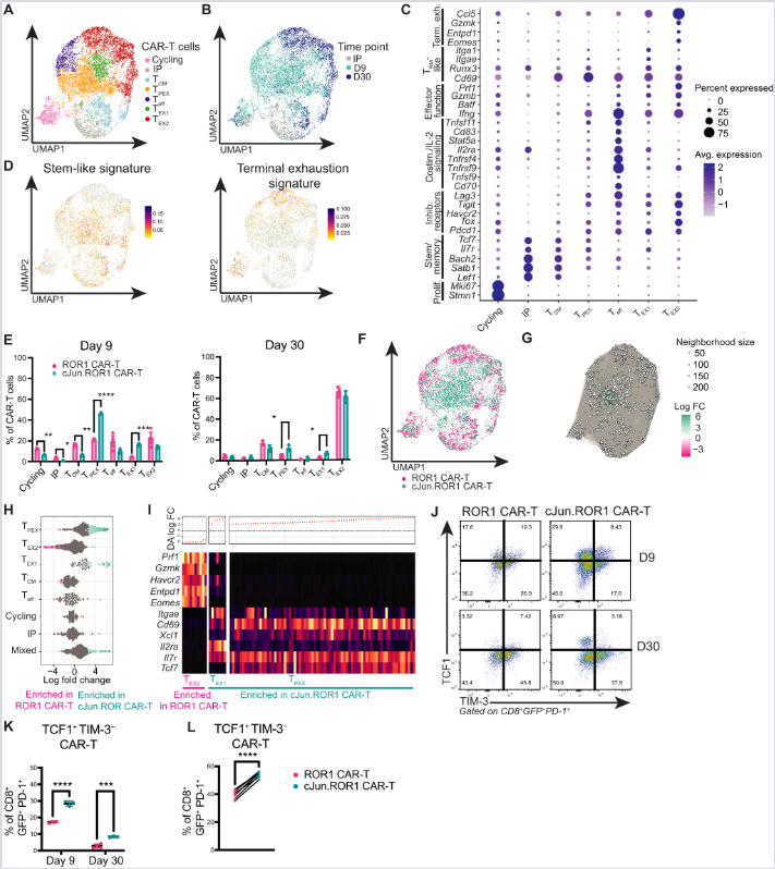 (A–C) scRNA-seq analiza i nenadzirano klasterovanje cJun.ROR1 i standardnih CAR-T ćelija (IP, dan 9 i 30 post-infuzije). Dot-plot (C) identifikuje ključne genske potpise subklastera.