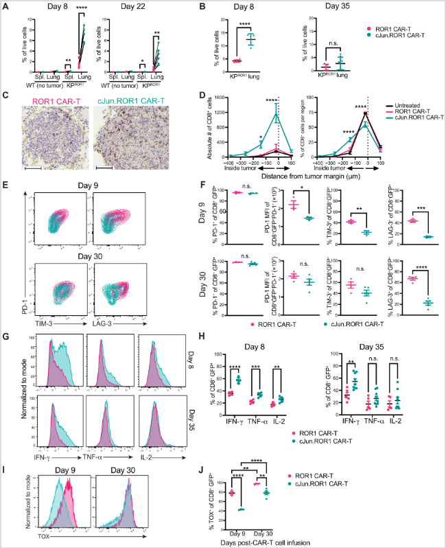 (E, F) Ekspresija inhibitornih receptora (PD-1, TIM-3, LAG-3) na CD8⁺ CAR-T ćelijama 9. i 30. dana. c-Jun značajno odlaže, ali ne sprečava iscrpljenost. n = 3–5 miševa/grupi.
