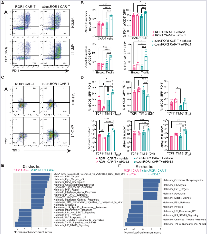 (E, F) GSEA analiza (Normalized Enrichment Scores) za ROR1 vs. cJun.ROR1 ćelije tretirane vehikulumom (E) ili anti-PD-L1 antitelom (F). Rezultati potvrđuju superioran progenitorski profil c-Jun modifikovanih ćelija pod dejstvom checkpoint blokade. n = 3–5 miševa/grupi.