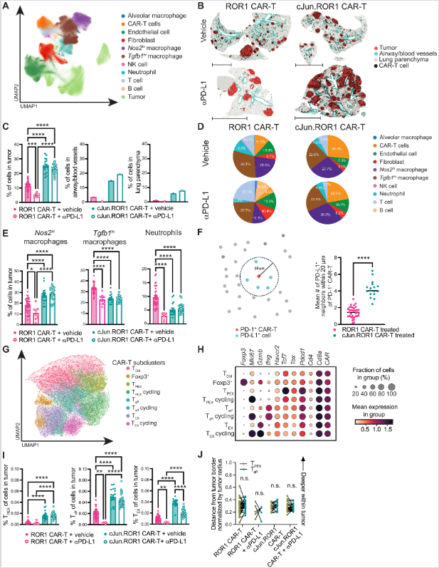 (G–I) Subklasterovanje CAR-T ćelija na osnovu prostorne ekspresije gena. Dot-plot (H) i kvantifikacija (I) potvrđuju da c-Jun modifikacija uz anti-PD-L1 dramatično smanjuje udeo terminalno diferenciranih ćelija u korist progenitorskih populacija. n = 6–35 nodusa.